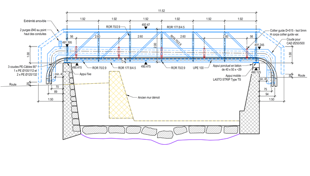 Cette passerelle permet la traversée de deux conduites pour le chauffage à distance et de trois canalisations à câble pour la société Oiken.